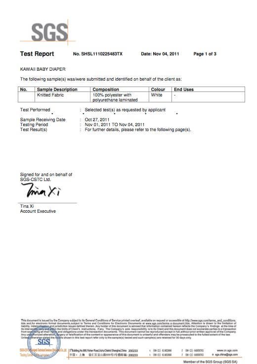 We set extremely high standards in designing and manufacturing our products. Our diapers are custom made by our trusted factory in China. Our fabrics meet rigorous specifications for safety, softness, durability, and absorbency. All our materials have been tested and certified by internationally recognized organizations. Please see our certifications below.