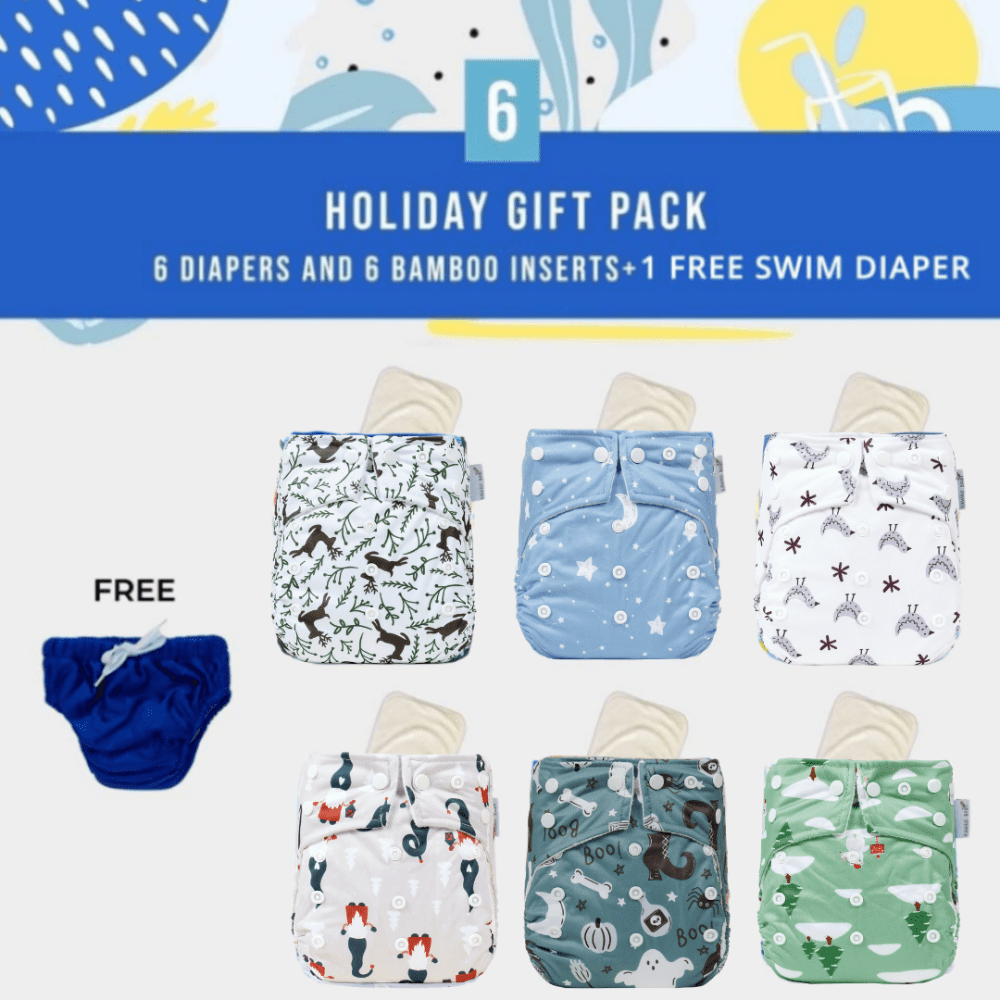 6 One Size Cloth Diapers + 6 Premium Bamboo Inserts + 1 Free Swim Diaper Blue Dream
