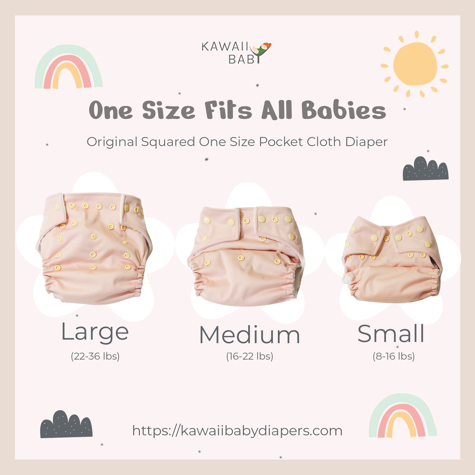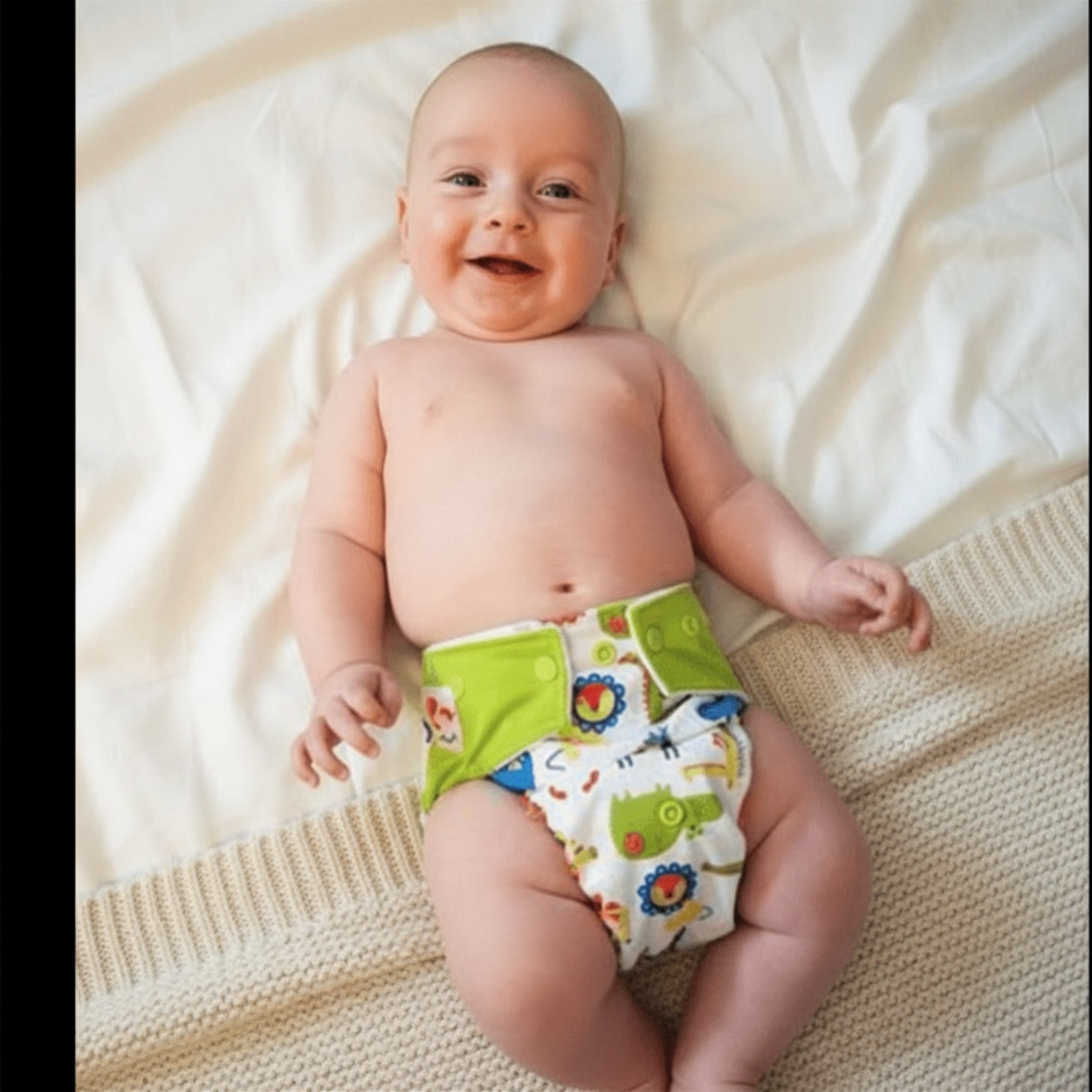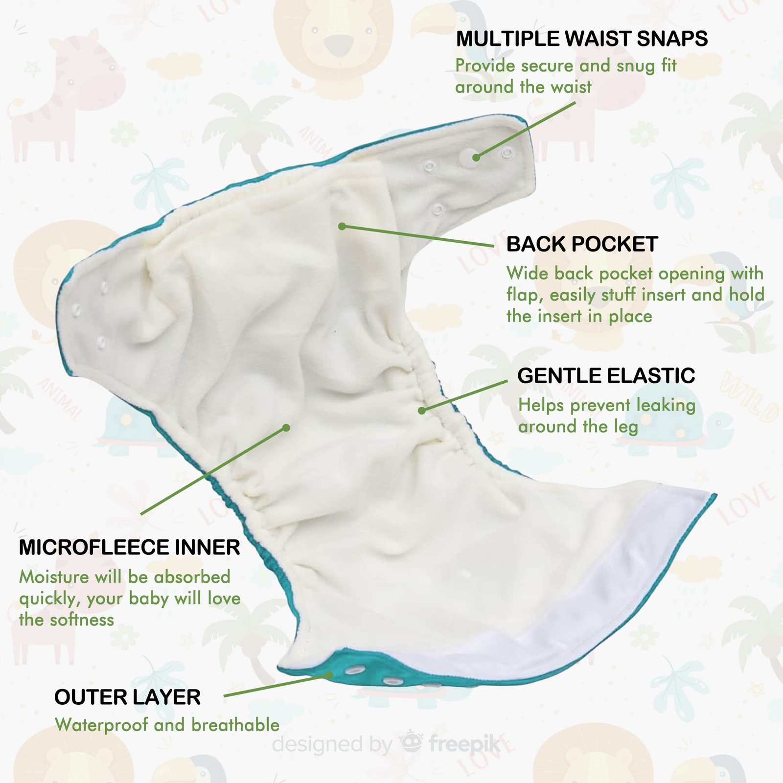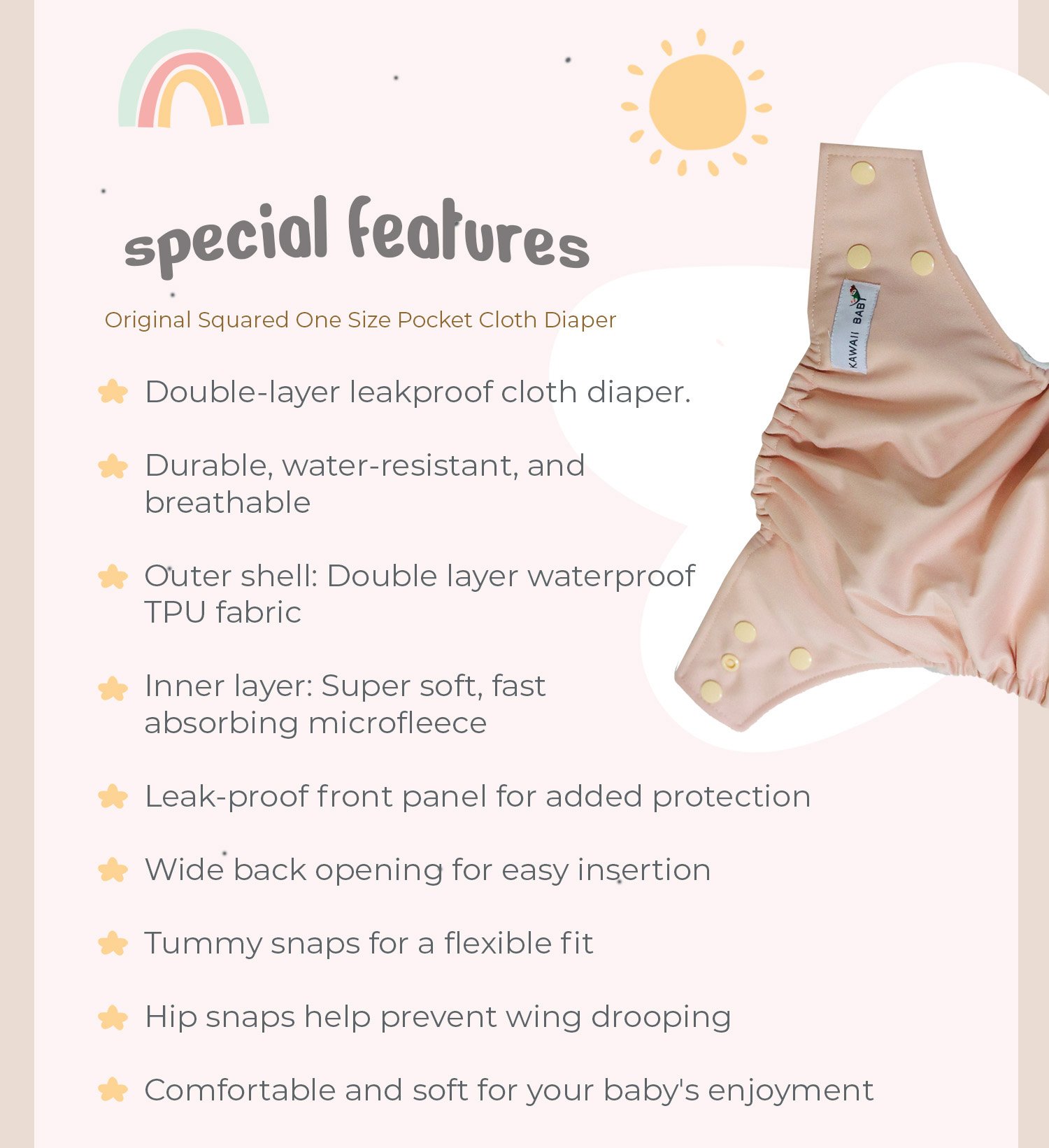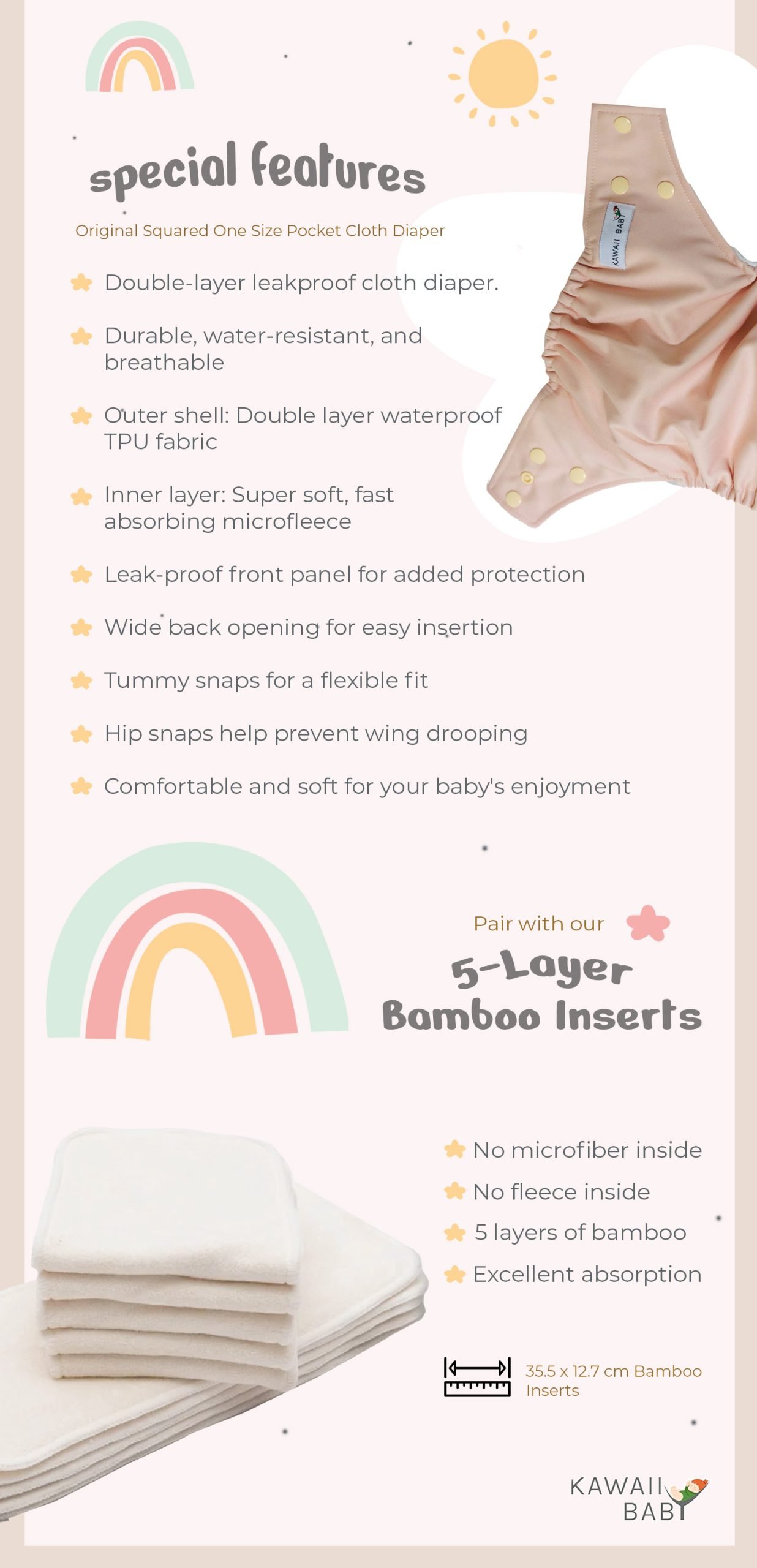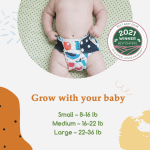 • Suede cloth inner:  Wicks moisture away from the skin and keep your baby’s bottom dry