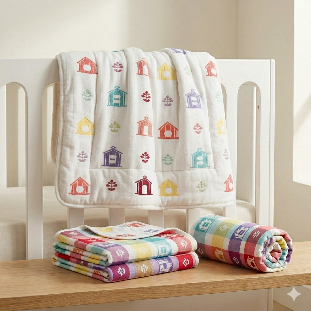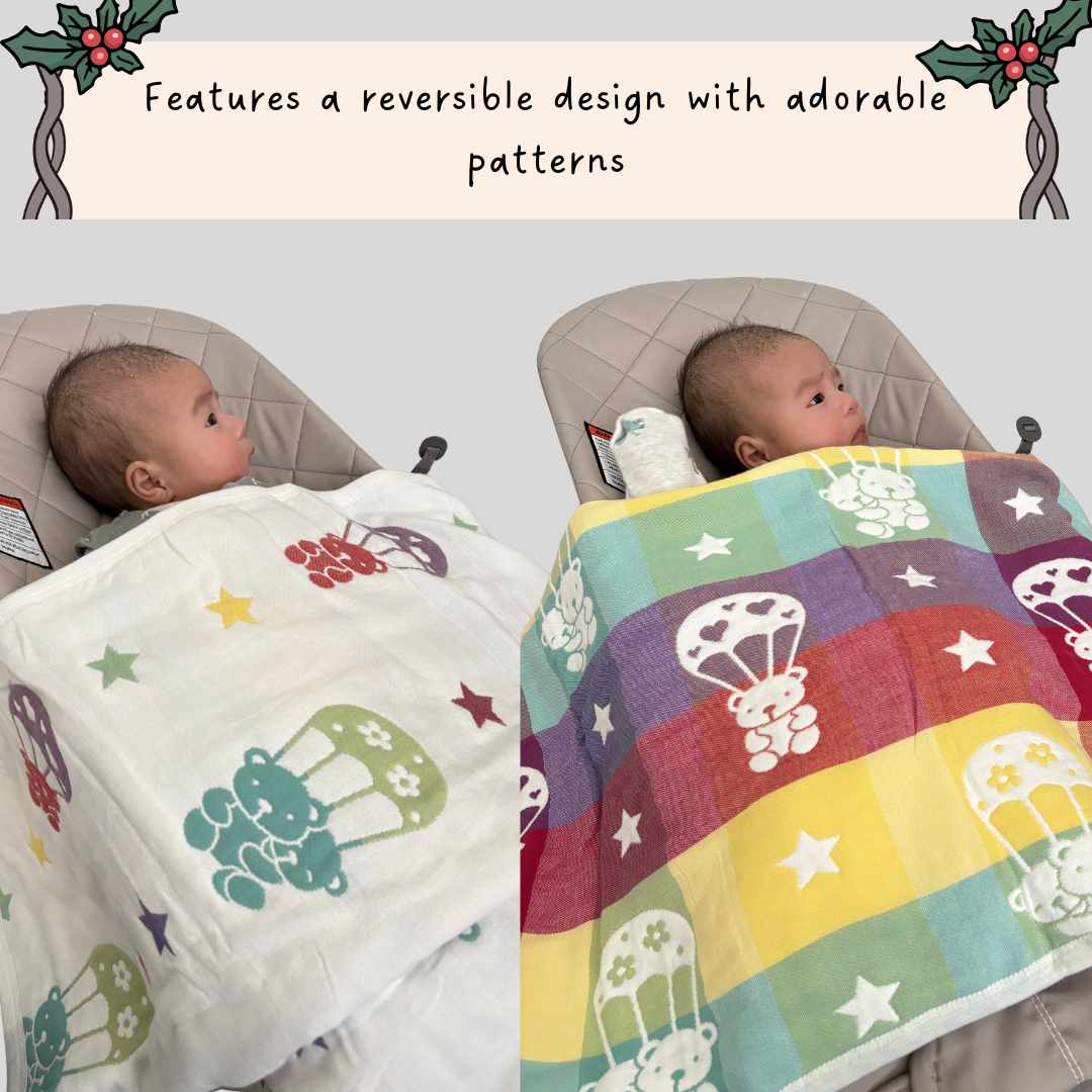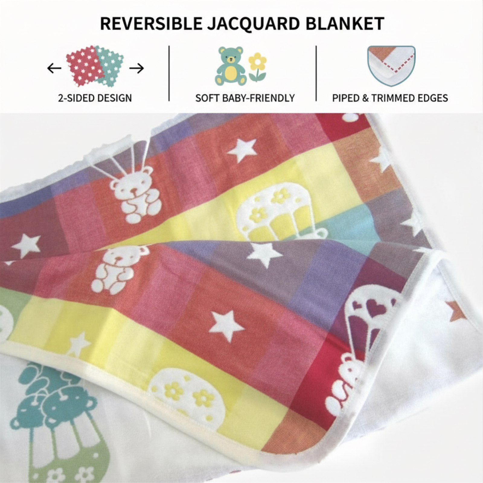 Discover the perfect blend of comfort and versatility with our double-layer muslin jacquard cotton blanket. Designed to be breathable, super soft, and cozy, this multi-functional blanket is an essential addition to your nursery.