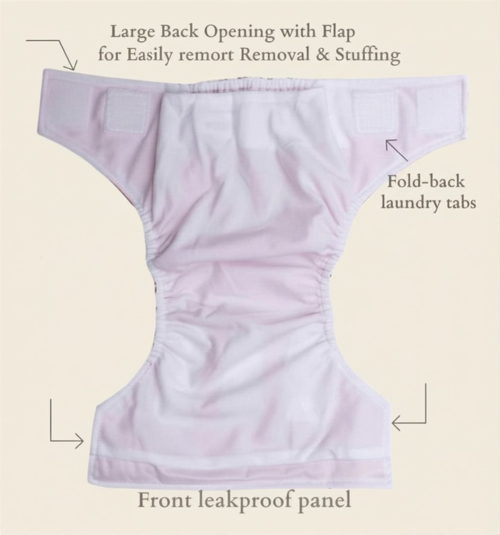 - Wide Back Pocket Opening:Â For easy insertion of inserts, once stuffed, it is just like an (AIO) All In One diaper