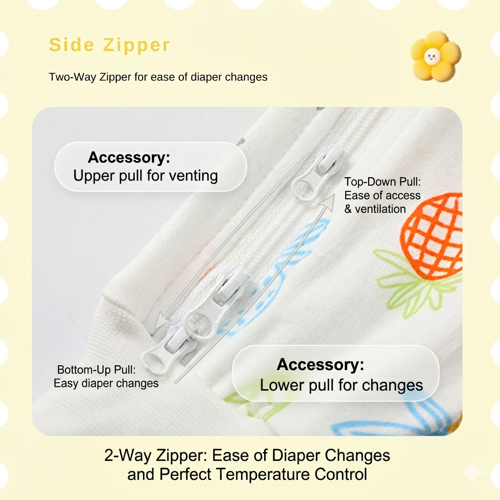 - Â Zipper down center front and along left inseam for easy diapering and dressing